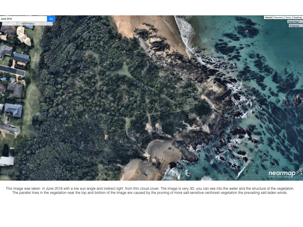 The orientation of the slices was WNW-ESE, indicating that the force causing the imbrication was from the NNE. Many major ridgelines along the Coffs Coast follow the orientation of these slices, and the pattern of headlands and infilled bays and beaches reflects the more and less erodible vertical sediment layers respectively. These imbricate layers were later faulted, with the somewhat radial pattern of faults occurring more or less at right angles to the imbrication reflecting the rotation associated with the development of the orocline during the Late Carboniferous and Permian Periods.